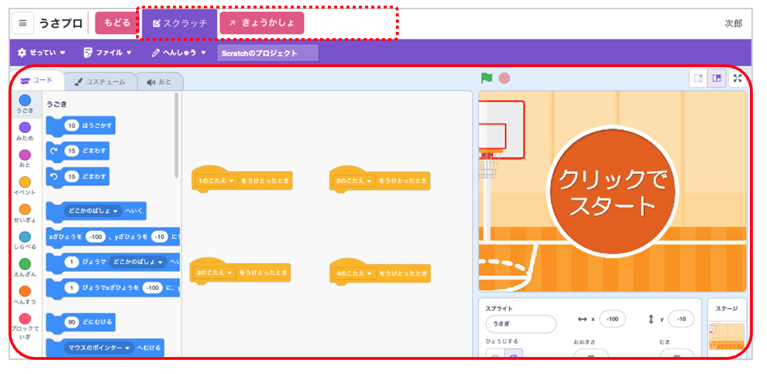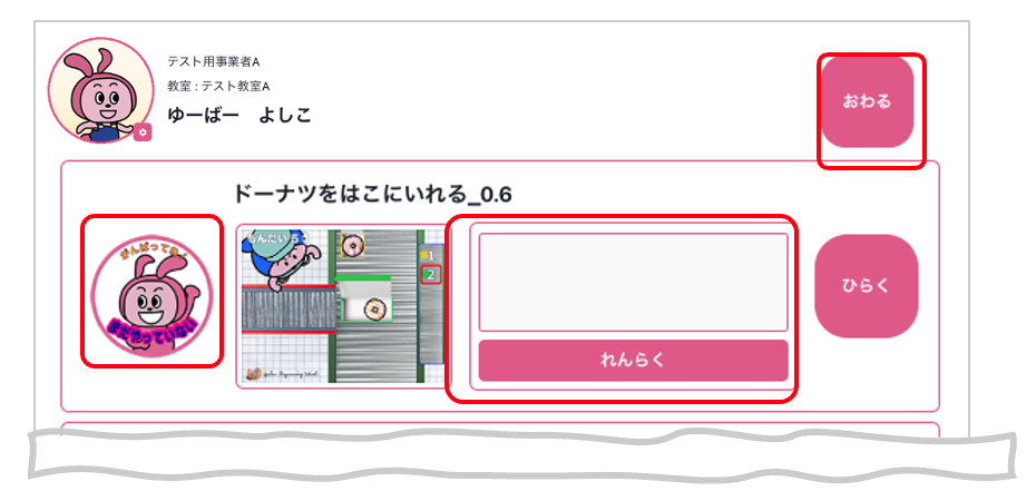 先生から学習順序の指示などコメントがある場合は「れんらく」欄の枠内に表示されます。 - スクラッチ画面で学習します