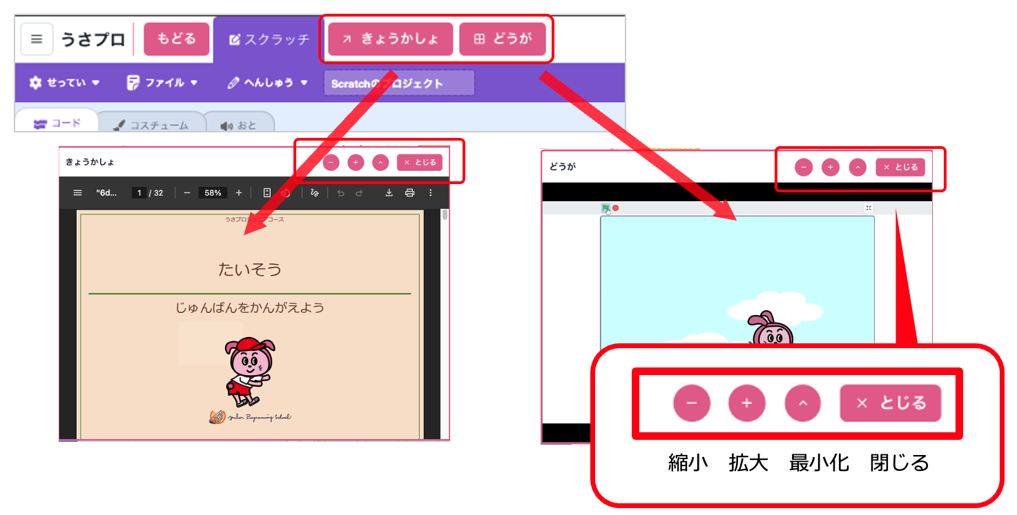 上部の「きょうかしょ」ボタンや「どうが」ボタン押すと教科書や動画ウィンドウが表示されます。